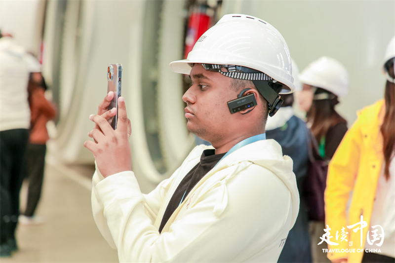 斐济广播公司记者尼基尔·库马尔(Nikhil Kumar)参观运达风电装备制造厂房。环球网供图