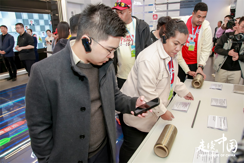 外媒记者掂量厂房内的巨型螺栓。人民网 杨春燕摄