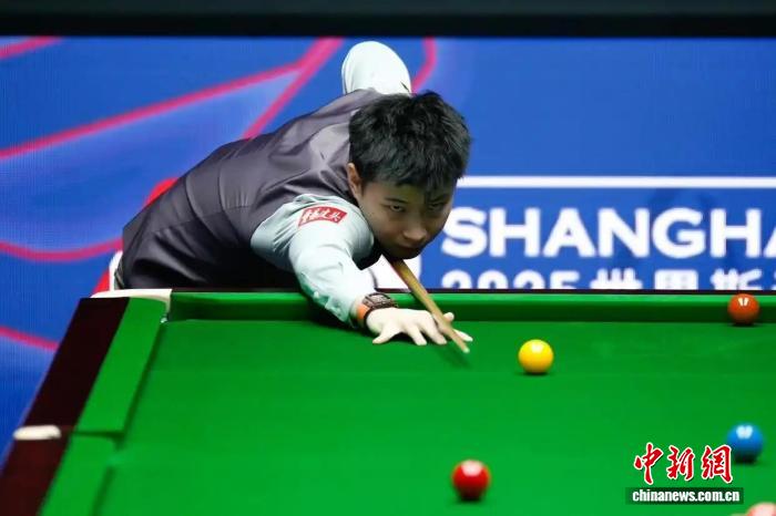 7月31日晚间,斯诺克上海大师赛四分之一决赛上,丁俊晖与赵心童上演强强对话。图为赵心童在比赛中。(主办方供图)