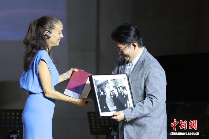 9月22日,“光影百年·中法同行”电影音乐会在北京中山公园音乐堂举行。图为喜剧大师卓别林的孙女卡门·卓别林(左)向京剧大师梅兰芳曾孙梅玮赠送卓别林与梅兰芳在上海见面的合影,梅玮回赠丛书《梅兰芳菲》。杨郁然 摄