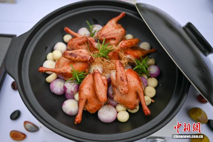 9月27日,一场精彩的厨艺技能大赛在四川眉山市东坡区太和公园星光湾举行。专业与业余选手同台竞技,为现场民众及游客呈现了一场兼具视觉与味觉的美食品鉴盛宴。图为参赛菜品“五指毛桃焗乳鸽”。中新社记者 刘忠俊 摄
