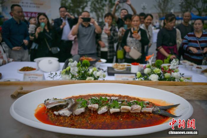 9月27日,一场精彩的厨艺技能大赛在四川眉山市东坡区太和公园星光湾举行。专业与业余选手同台竞技,为现场民众及游客呈现了一场兼具视觉与味觉的美食品鉴盛宴。图为“麻辣翘壳鱼”等参赛菜品吸引民众驻足拍照和观赏。中新社记者 刘忠俊 摄