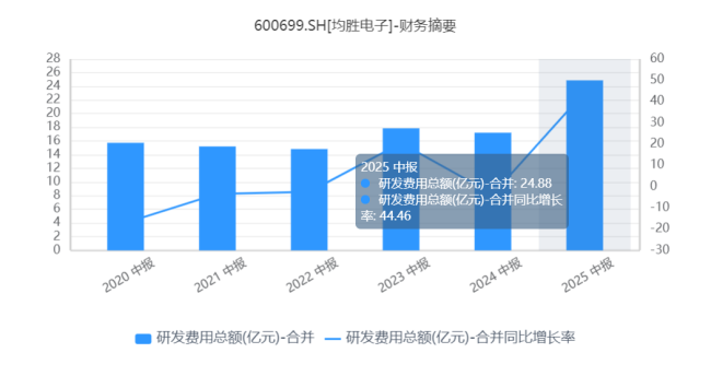 2022年至2024年,公司研发投入分别为30.34亿元、36.48亿元、36.86亿元。2025年上半年,研发投入达到24.88亿元,同比增长44.48%,占营业收入比重8.2%。