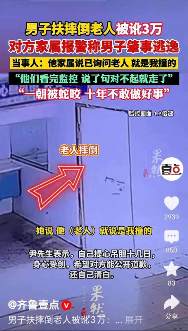 扶老人反被讹 不能止于“道歉”了事 善意需法律保护!湖南桃源的尹先生带孩子去医院看病时,好心扶起摔倒的老人,却被家属指责为“肇事逃逸”。顶着十多天的精神压力,尹先生最终找到隐蔽监控证明电动车与老人自行车无接触。交警核实后,家属才道歉了事。这件事再次引发了关于“扶老人怕被讹”的社会讨论。