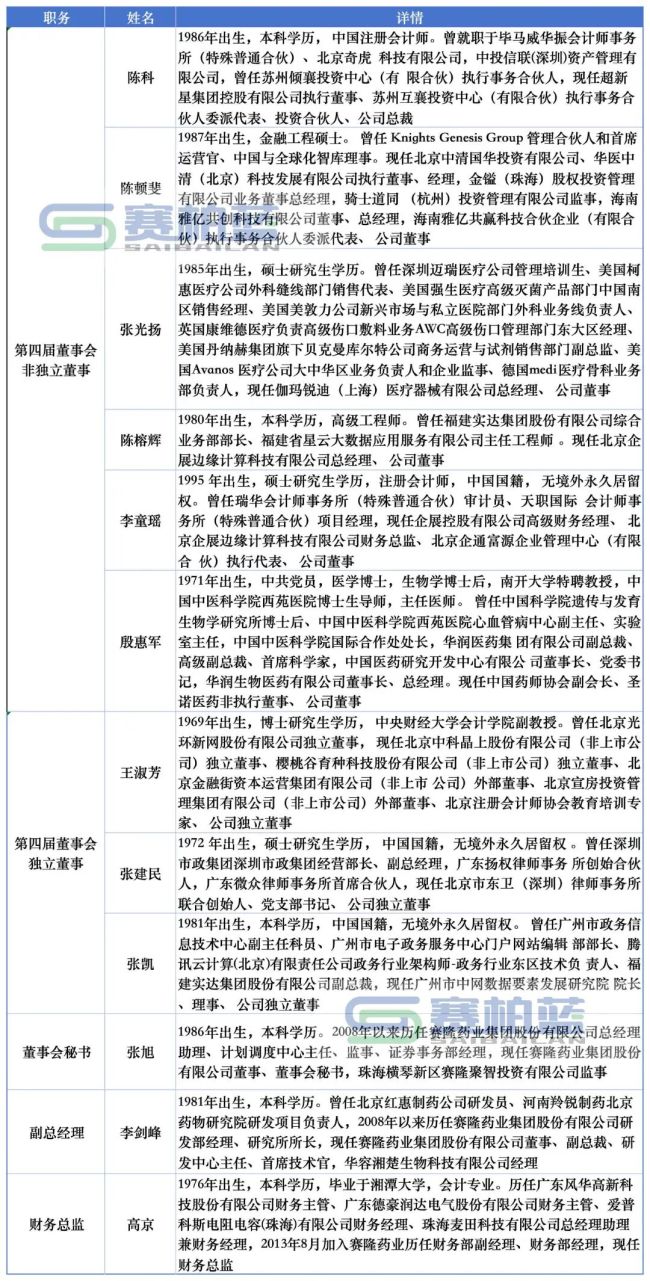 另外,在本次辞职公告发布前一周,公司临时股东会还补选了具有医学背景——曾担任华润生物董事长、总经理,现任中国药师协会副会长、圣诺医药非执行董事的殷惠军为赛隆药业非独立董事。