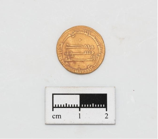 当天由于沙特遗产委员会来考察,考古队员在桌子上摆放了一批文物标本,有青铜底盘、中国瓷器碎片、青铜勺、玻璃器、玛瑙串珠、贝壳等。考古队员郭东珺从怀中掏出一枚金币。金币薄如纸片,两面印刻着阿拉伯文字。“经考证,这枚金币属于阿巴斯王朝时期,大约相当于中国的唐宋时期。”
