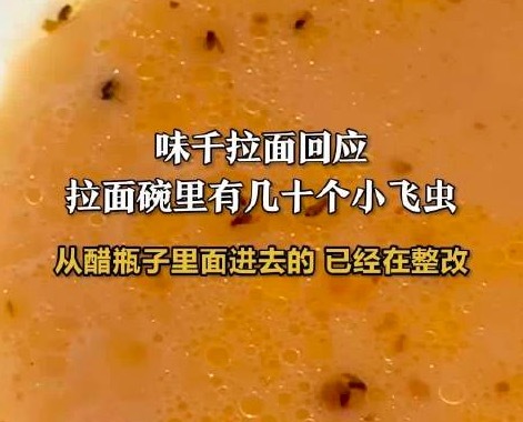 近日,广东深圳,一女子发视频称自己在味千拉面店里吃拉面,发现碗里有几十个小飞虫。对此,店铺工作人员回应记者称,可能是醋瓶子里的小飞虫,醋的气味比较重,没有及时放冰箱,引来了小飞虫,目前已在整改,会加强管理,还在和顾客协商赔偿的事。