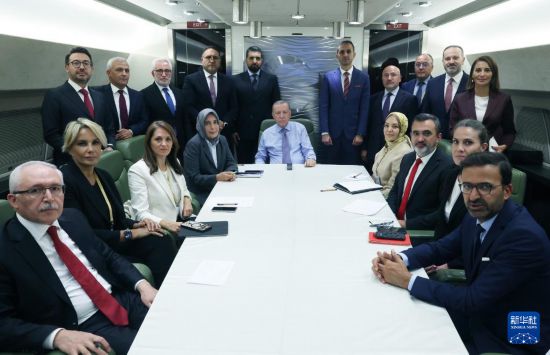 10月14日,土耳其总统埃尔多安(中)在出席沙姆沙伊赫峰会后返回土耳其的专机上与随行记者合影。新华社发(土耳其总统府供图)