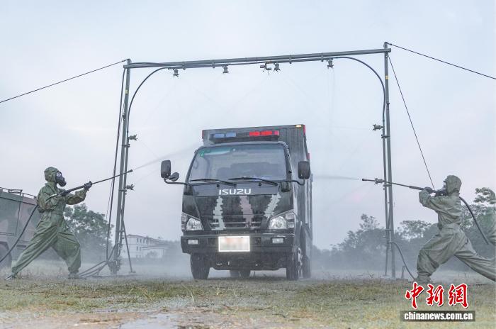 图为防化分队官兵正在对车辆进行洗消。何家龙 摄