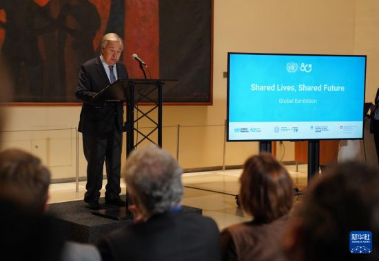 10月20日,在位于纽约的联合国总部,联合国秘书长古特雷斯在“共栖生命,共享未来”庆祝联合国成立80周年全球图片展启动仪式上致辞。新华社记者 张凤国 摄