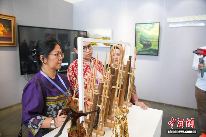 10月29日,丝路华章——第十二届中国—东盟(南宁)戏剧周戏剧艺术展在南宁博物馆正式开展。图为演员在现场演奏印度尼西亚传统乐器“昂格隆”。中新社记者 陈冠言 摄