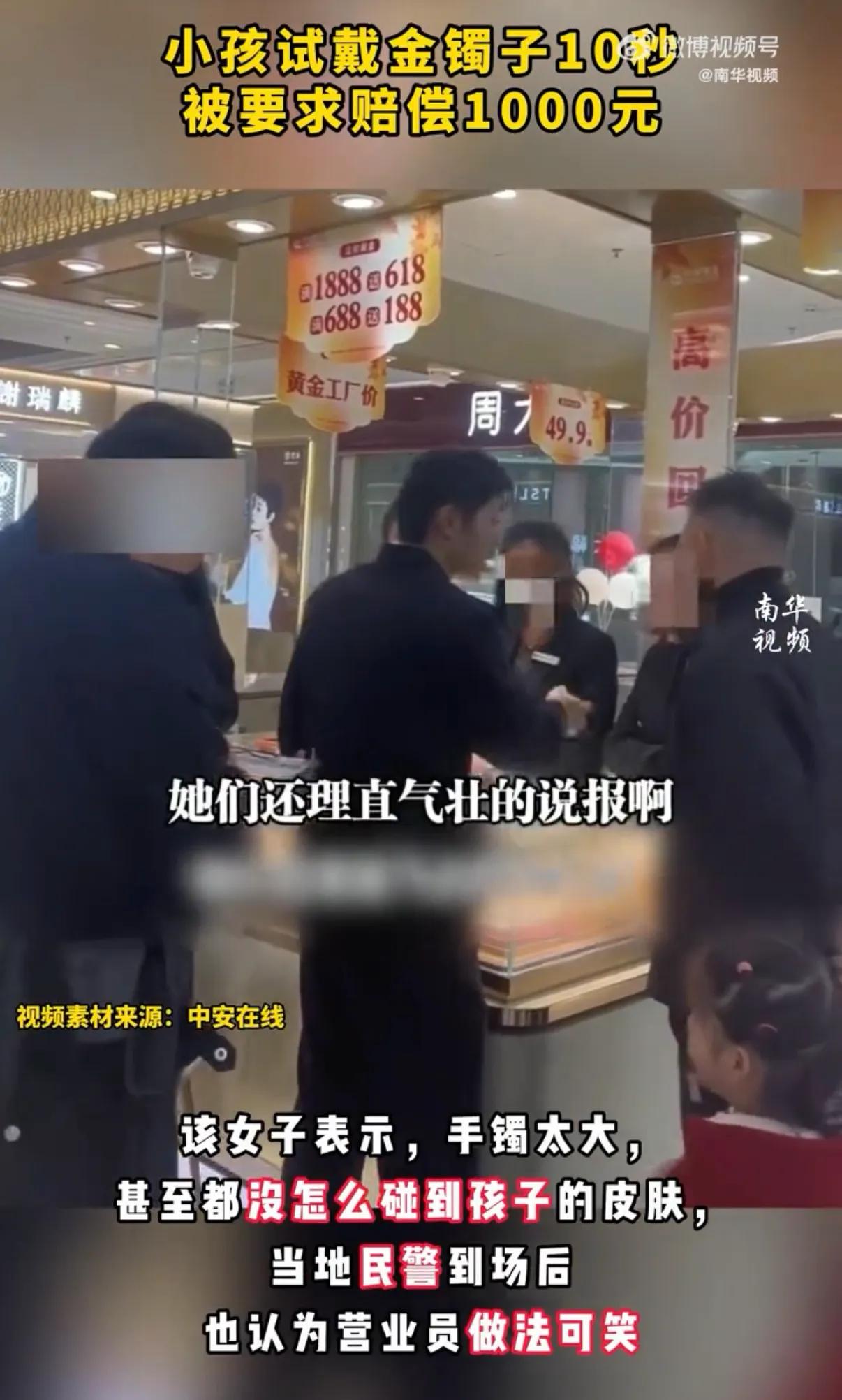 试戴金镯10秒被索赔1000店员要求引争议!11月12日,一名女子带着孩子逛金店时,在营业员全程注视下试戴了一个黄金手镯不超过10秒。取下手镯时,营业员称手镯变形,要求赔偿1000元,否则不让她们离开。女子表示,手镯太大,甚至都没怎么碰到孩子的皮肤。当地民警到场后认为营业员的做法可笑。