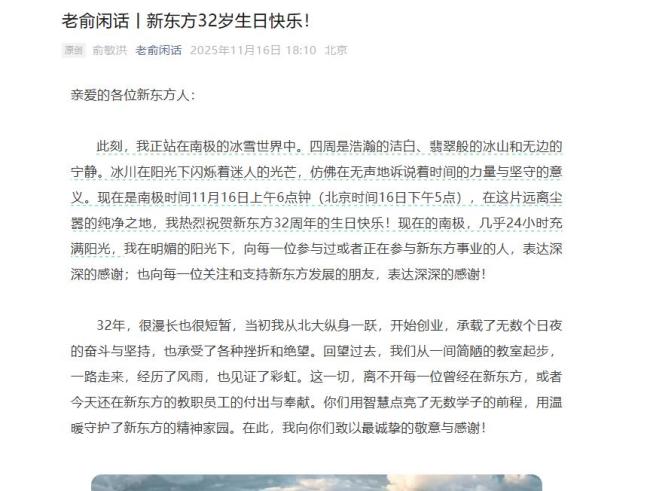 11月16日,新东方刚过完32岁生日,创始人俞敏洪在南极发布了一封题为“冰雪中的坚守”的内部信,向全体员工和支持者致谢。然而这封信并未如预期般暖心,反而引发了员工的广泛吐槽。