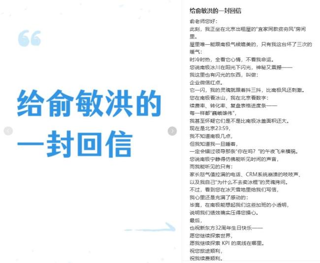 与信中描绘的“诗和远方”形成鲜明对比的是国内员工面临的现实困境。一位教育板块员工透露,纪念日当天自己上完课后连夜加班赶制续费方案,读到信中南极风光的描述时感到讽刺。社交平台上,“今夜,所有xdfer(新东方人)都是南极人”的调侃广为流传,暗指老板与员工处境的巨大差异。