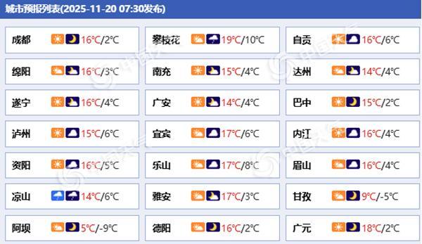 受冷空气影响,四川南部等地昨天出现降温,局地降温明显,降幅超10℃。今天早晨,冷空气余威仍存,成都最低气温仅2.3℃,创下半年来新低。