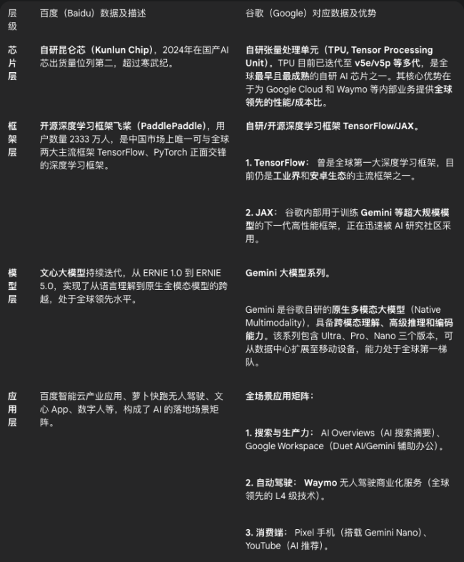 尤其是芯片层,百度和谷歌都明白,要保持AI领先,就必须掌握底层硬件,自己设计芯片,自己优化软件,跑自己的模型,这能带来更高的性能和更低的成本。