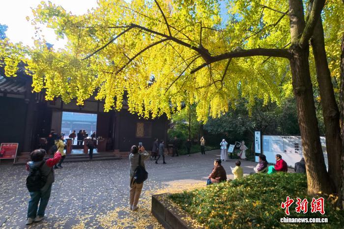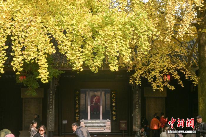 11月24日,初冬暖阳下,四川省眉山市东坡区纱縠行南街的三苏祠博物馆南门内,高大的银杏树渐染金黄,金黄叶片随风轻舞,吸引不少游客驻足观赏、拍照留念,现场洋溢着浓浓的诗意与雅致氛围。图为三苏祠南门渐染金黄的银杏吸引游客拍照。中新社记者 刘忠俊 摄