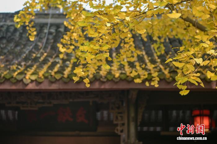11月24日,初冬暖阳下,四川省眉山市东坡区纱縠行南街的三苏祠博物馆南门内,高大的银杏树渐染金黄,金黄叶片随风轻舞,吸引不少游客驻足观赏、拍照留念,现场洋溢着浓浓的诗意与雅致氛围。图为渐黄银杏和三苏祠古建筑。中新社记者 刘忠俊 摄