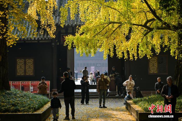 11月24日,初冬暖阳下,四川省眉山市东坡区纱縠行南街的三苏祠博物馆南门内,高大的银杏树渐染金黄,金黄叶片随风轻舞,吸引不少游客驻足观赏、拍照留念,现场洋溢着浓浓的诗意与雅致氛围。图为三苏祠南门游客。中新社记者 刘忠俊 摄