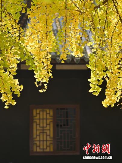 11月24日,初冬暖阳下,四川省眉山市东坡区纱縠行南街的三苏祠博物馆南门内,高大的银杏树渐染金黄,金黄叶片随风轻舞,吸引不少游客驻足观赏、拍照留念,现场洋溢着浓浓的诗意与雅致氛围。图为三苏祠南门的古银杏树渐染金黄。中新社记者 刘忠俊 摄