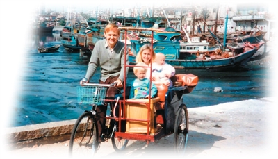 一九八八年,迁居中国后,潘维廉(左一)骑着三轮车带着家人走遍厦门大街小巷。