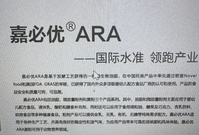 据了解,ARA即花生四烯酸,又称二十碳四烯酸)是一种Omega-6多不饱和脂肪酸(CAS号:506-32-1),属于人体必需脂肪酸,在婴幼儿生长发育过程中,可以促进大脑发育、促进视网膜形成,增强免疫力等。是高端婴幼儿配方食品中的常见添加成分,因此几乎大部分婴幼儿奶粉企业都会在产品中添加ARA。