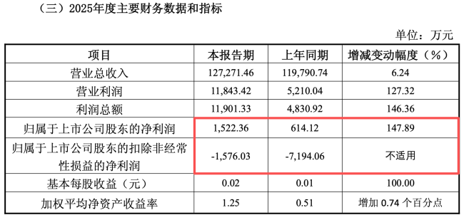 1月7日,被誉为“东北水王”“吉林省水”的吉林泉阳泉股份有限公司(下称“泉阳泉”)发布2025年度业绩预增公告。预计2025年度实现营业总收入12.73亿元,同比增长6.24%;预计实现归属于上市公司股东的净利润1522.36万元,比上年同期的614.12万元增加147.89%;不过,该公司的扣非净利润仍为亏损1576.03万元,较去年同期的亏损7194.06万元有所收窄。