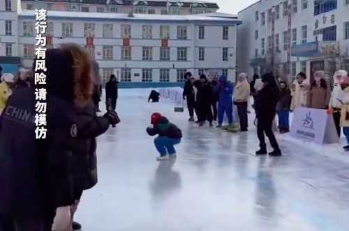 东北校园"打出溜滑"比赛中男孩滑出25.7米,喜提粘豆包一袋反差感拉满。