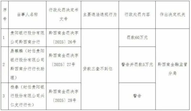 根据公开报道,2025年11月25日,贵阳银行黔西南分行因贷款“三查”不到位,被黔西南金融监管分局罚款60万元,成为该行近年来所收到的最大一笔罚款。