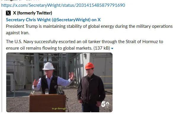 3月10日,美国能源部部长克里斯·赖特在X平台发布了一则帖文,称美国海军护送一艘油轮通过了霍尔木兹海峡。这一消息一度让市场担忧情绪缓解,石油、柴油和汽油期货应声下滑,股市则上扬。