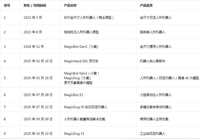 2025年,公司接连推出11自由度灵巧手MagicHand S01、高动态小人形机器人MagicBot Z1。