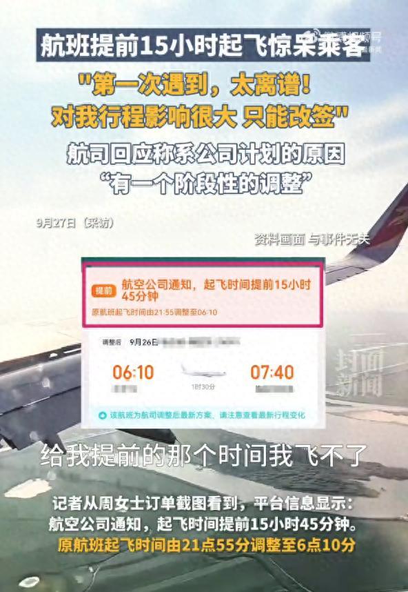 周女士最近遇到了一件让她意想不到的事情。她原本计划乘坐龙江航空的一趟航班,结果这趟航班提前了15个小时起飞。由于这个突然的变化,周女士不得不改签其他航班