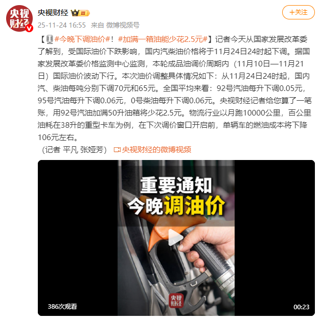 国家发展改革委宣布,受国际油价下跌影响,国内汽柴油价格将于11月24日24时起下调。本轮成品油调价周期内(11月10日—11月21日)国际油价波动下行。具体调整为:从11月24日24时起,国内汽、柴油每吨分别下调70元和65元