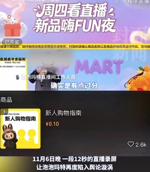 11月7日,“泡泡玛特直播事故”话题登上微博热搜第一。前一日,泡泡玛特直播间工作人员在展示售价79元的DIMOO挂链盲盒时,有人脱口而出“哎嘛,这东西卖79确实有点贵”,另一人回应“没事会有人买单的”。这段对话被实时播出后,引发了强烈不满