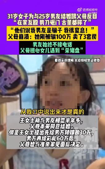 9月27日,河南郑州一名31岁女子为了与25岁的男友结婚,与父母发生了激烈争执。据报道,该女子在家与父母互殴,甚至用剪刀砸门、摔古董。在接受采访时,女子表示:“他们说我男友是骗子,我很窒息!”而她的父母则感到非常崩溃