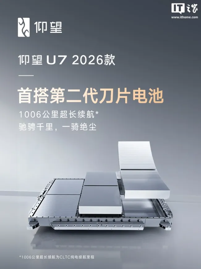 比亚迪旗下的仰望汽车宣布,新款仰望U7将首次搭载第二代刀片电池,提供1006公里的超长纯电续航里程(CLTC标准)