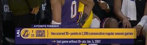 在北京时间的一场NBA常规赛中,洛杉矶湖人队主场以108-125输给了菲尼克斯太阳队,七连胜被终结。湖人球星詹姆斯表现不佳,出场31分14秒,10投3中得到10分、3次助攻,还有3次失误和2次犯规,正负值为-6