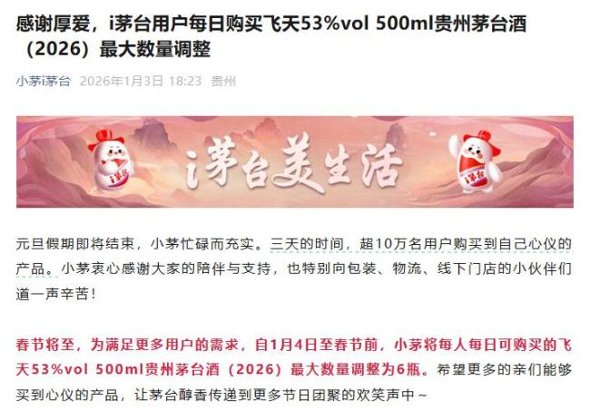 1月3日晚间,贵州茅台通过“小茅i茅台”宣布,为满足更多用户的需求,自1月4日至春节前,每人每日可购买的飞天53%vol 500ml贵州茅台酒(2026)的最大数量调整为6瓶。元旦假期三天内,超过10万名用户成功购买到心仪的产品