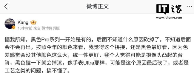 博主 @Kang 在微博上透露,苹果 iPhone 17 Pro 系列手机原本计划推出黑色版本,但后来被取消了。具体原因尚不清楚,也不确定未来机型是否会重新引入黑色