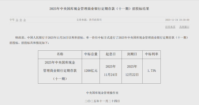 11月24日,央行官网公布了2025年中央国库现金管理商业银行定期存款第十一期和第十二期的招投标结果。财政部与中国人民银行当天以利率招标方式进行了这两期的招投标