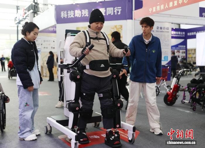 图为残疾人体验下肢外骨骼机器人。中新社记者 于晶 摄 图为残疾人线上销售手工制品。中新社记者 于晶 摄