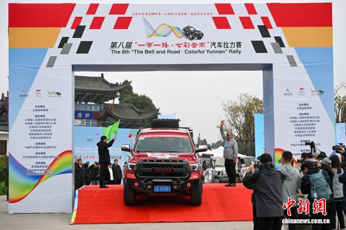 车辆通过发车门。中新社记者 李嘉娴 摄 发车仪式上,“云南26个民族同唱一首歌”节目吸引车手。中新社记者 李嘉娴 摄